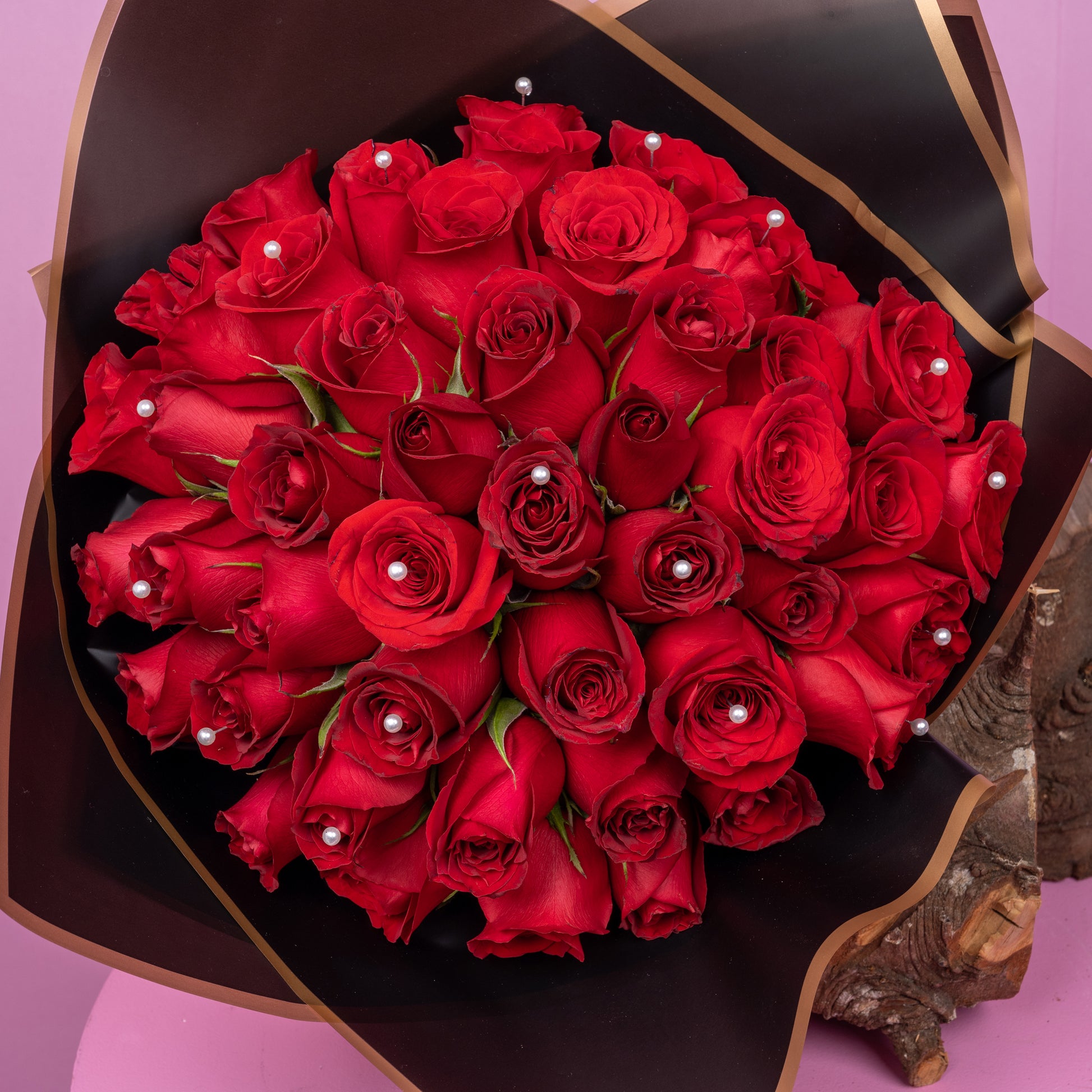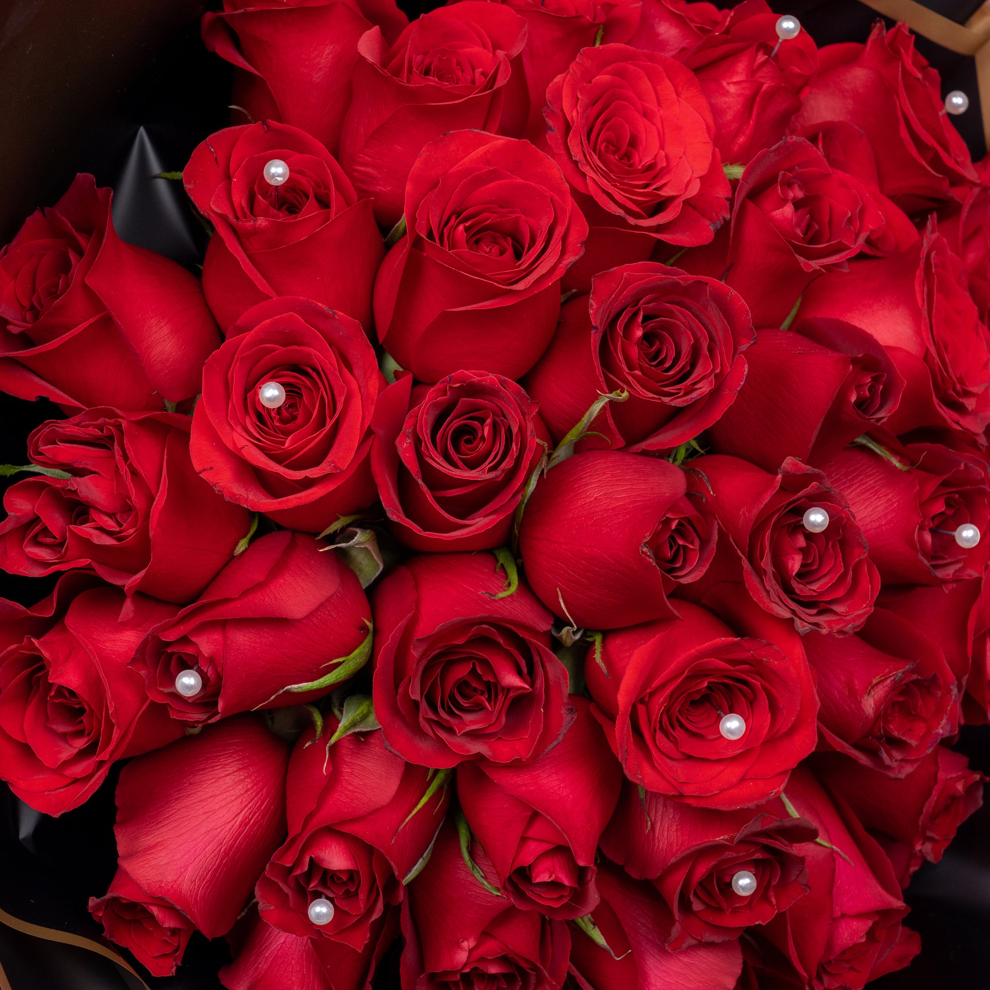 Descripción: Atado de 48 rosas rojas, con perlas dando forma de corazón sobre las rosas; envuelto en papel de color negro, en contraste con la flor.