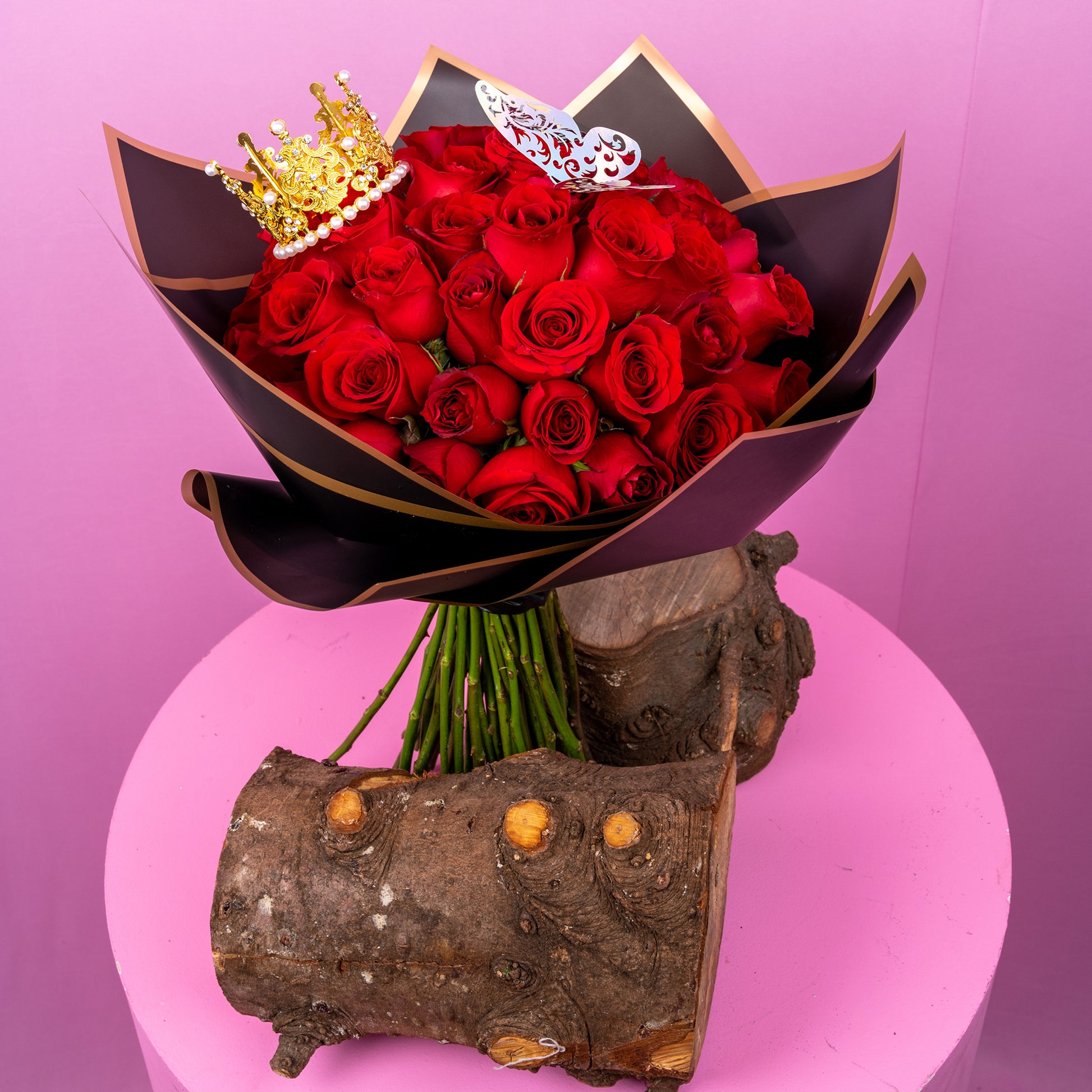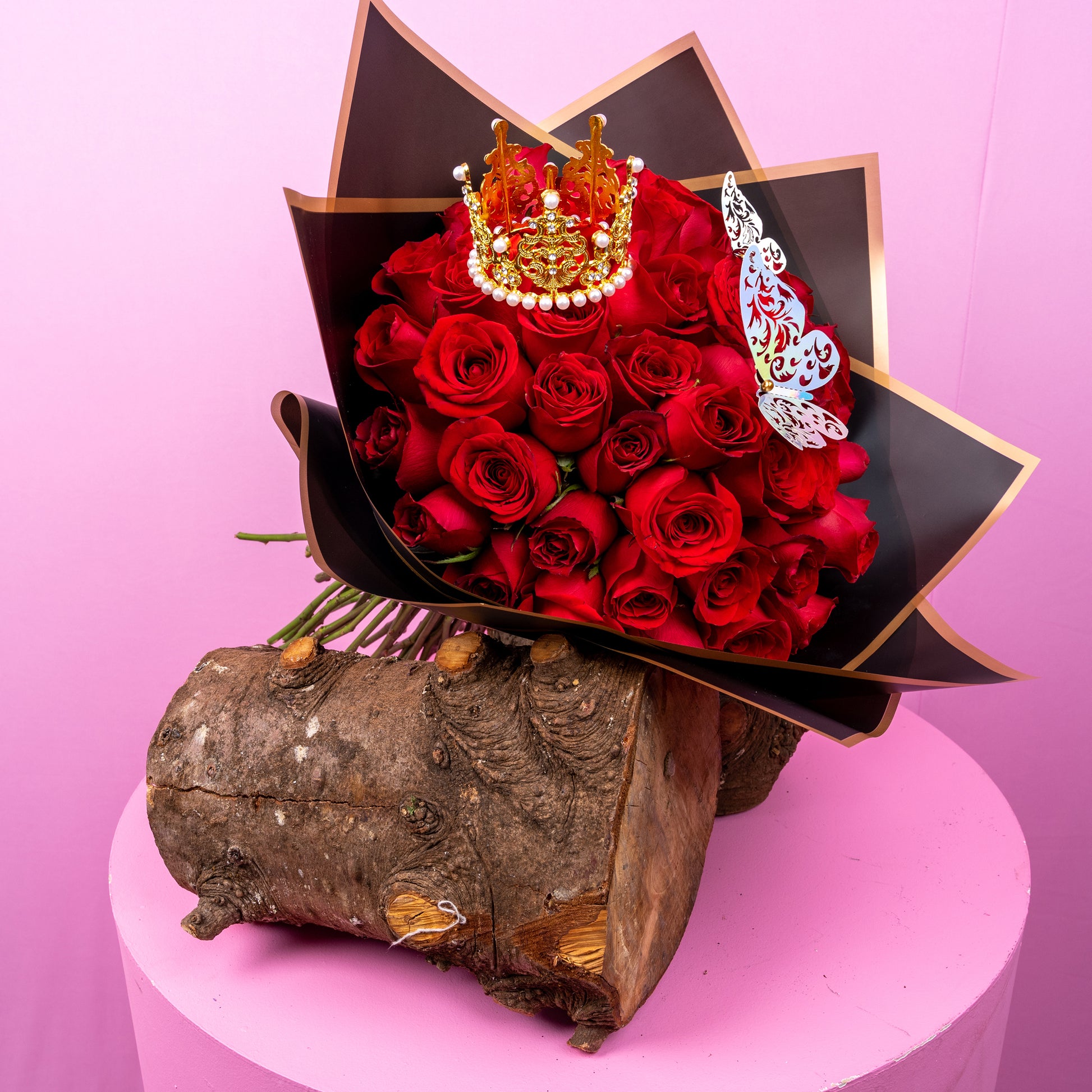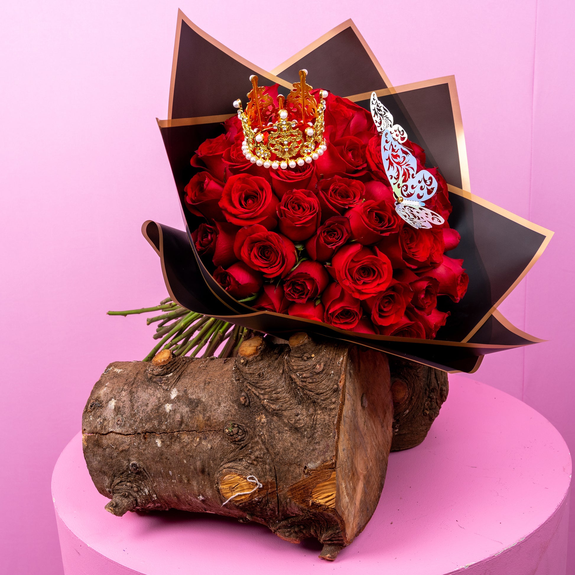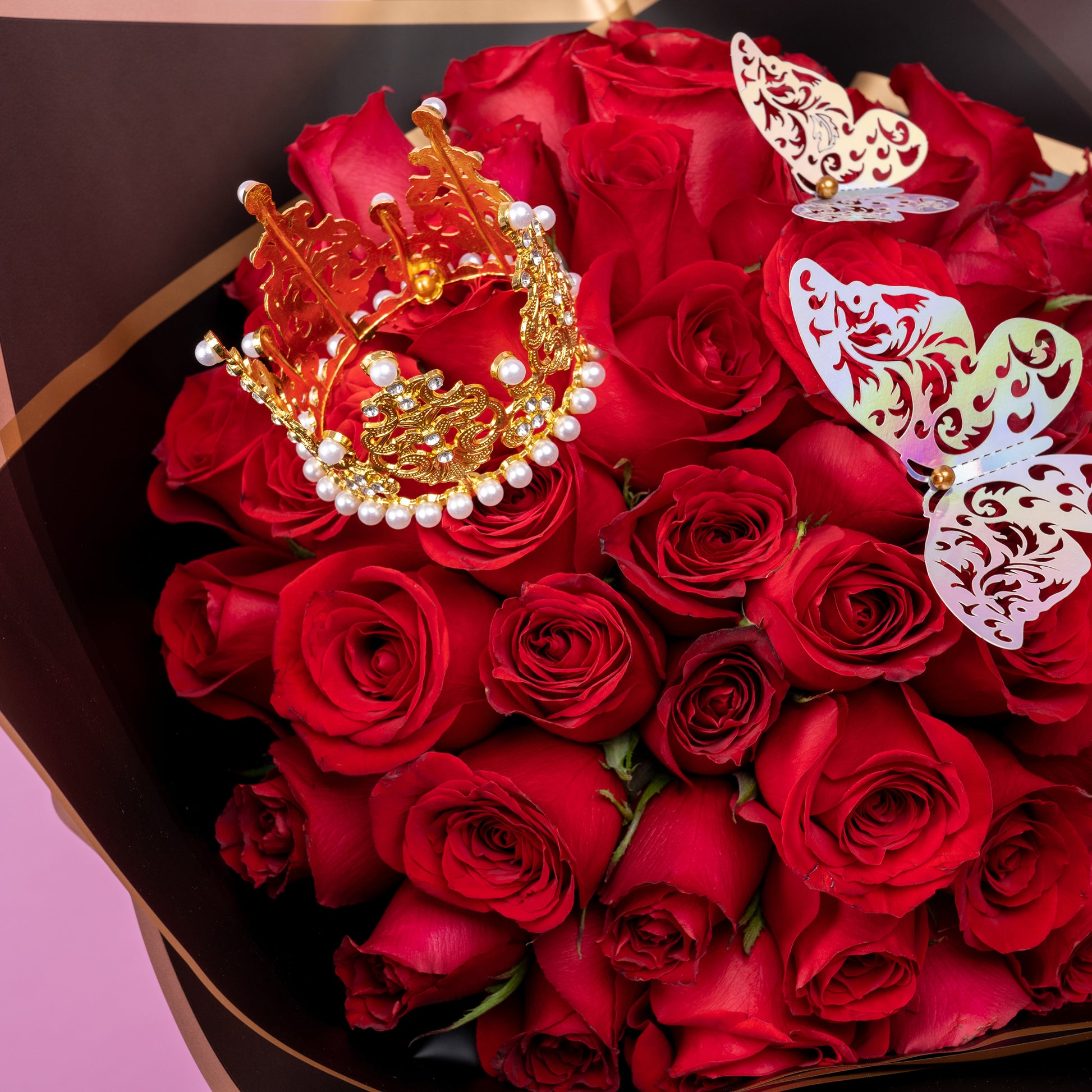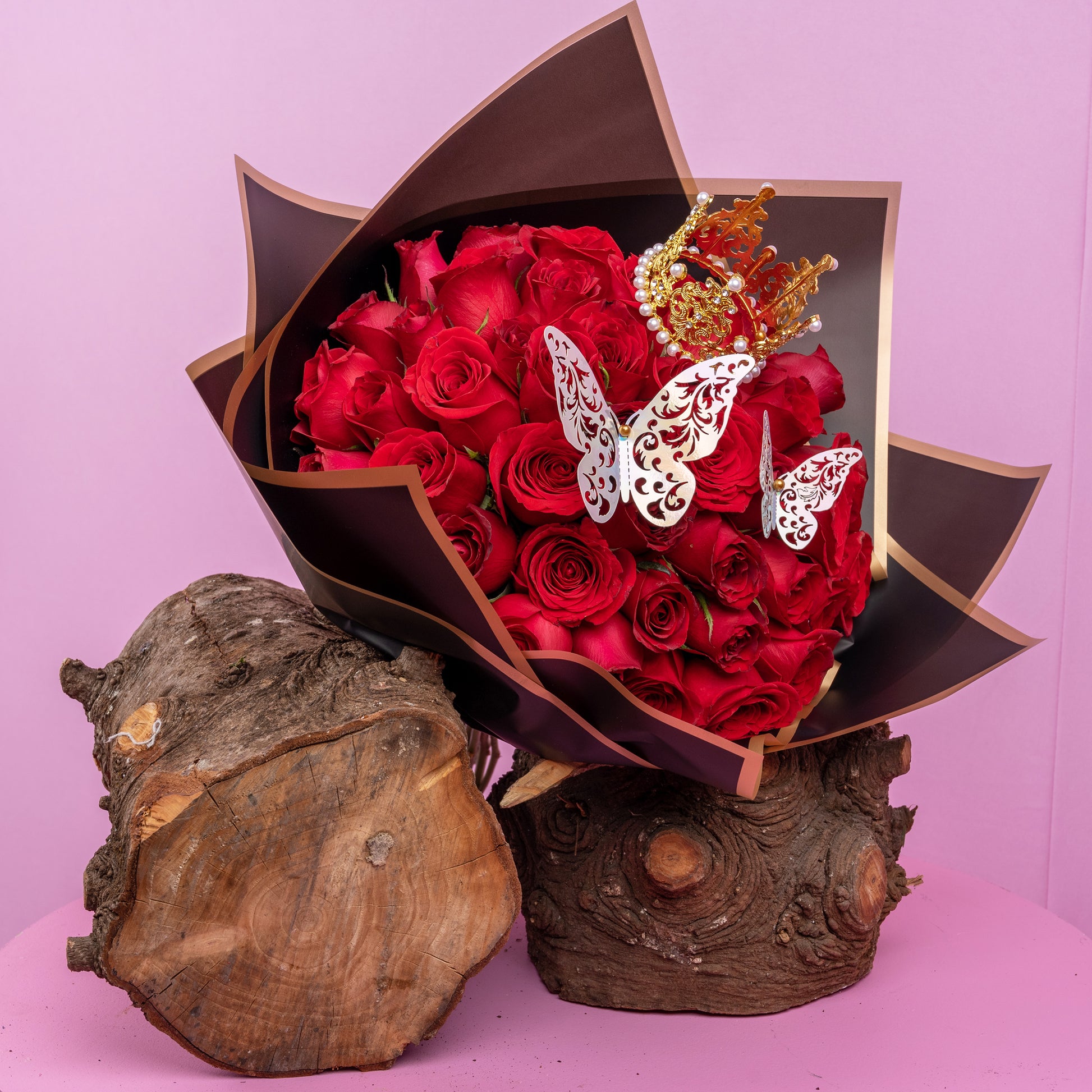 Descripción: Ramo de 50 rosas rojas, envuelto con papel especial para flor, adornado con una corona de perlas de plástico y dos mariposas de papel plastificado tornasol.