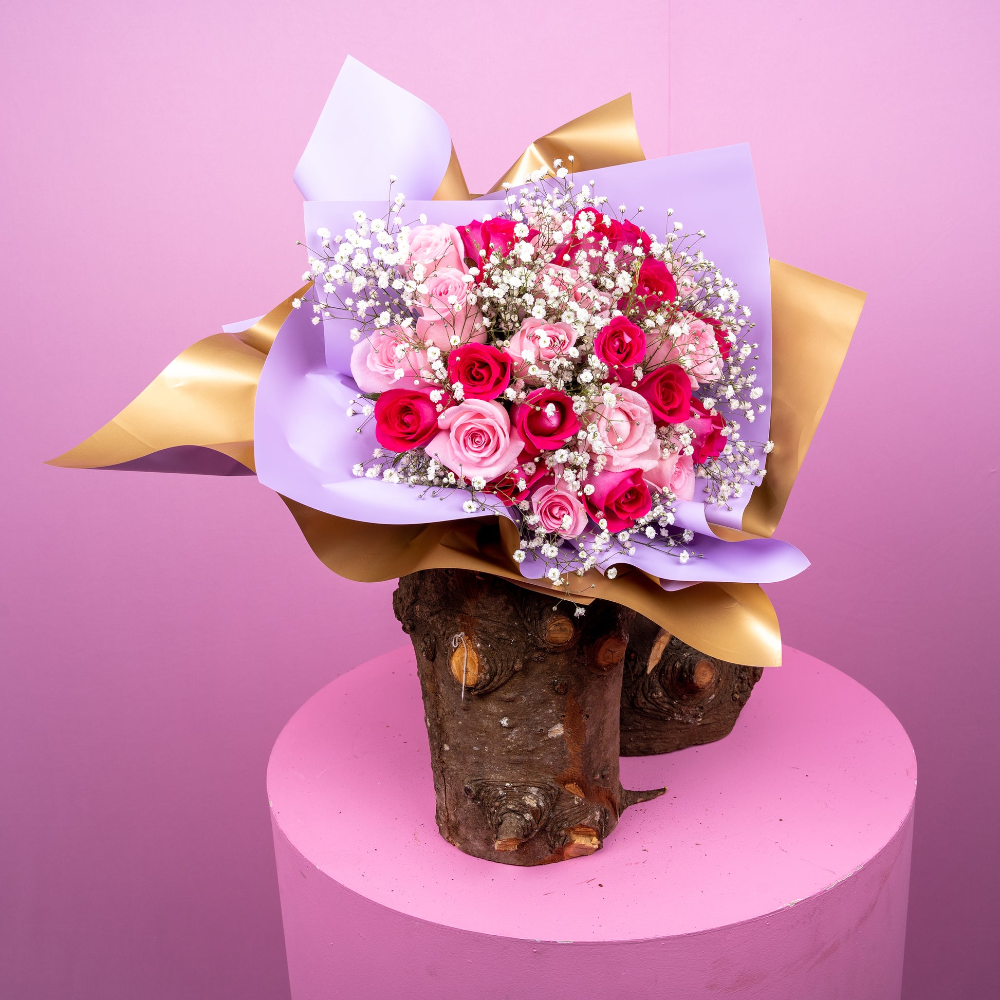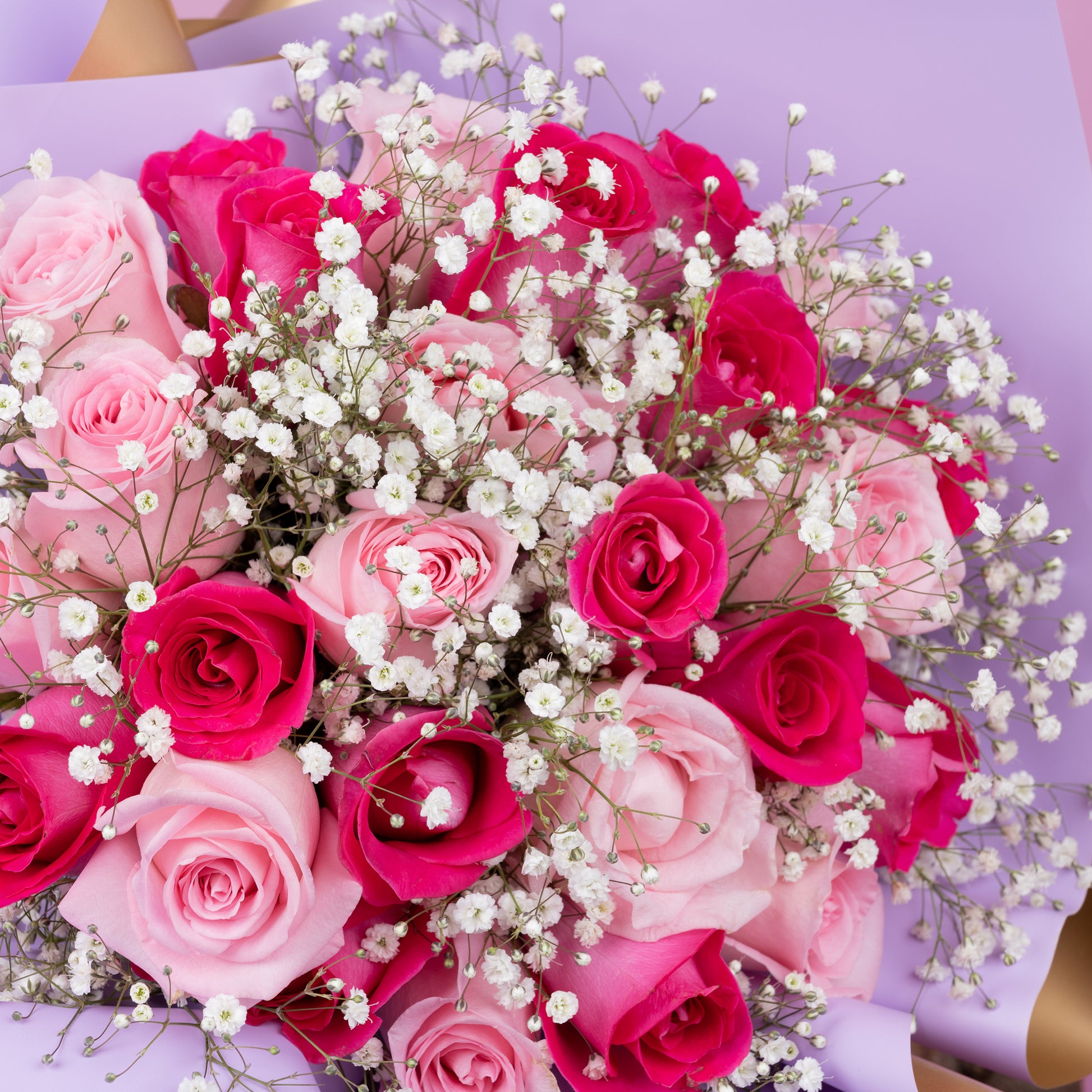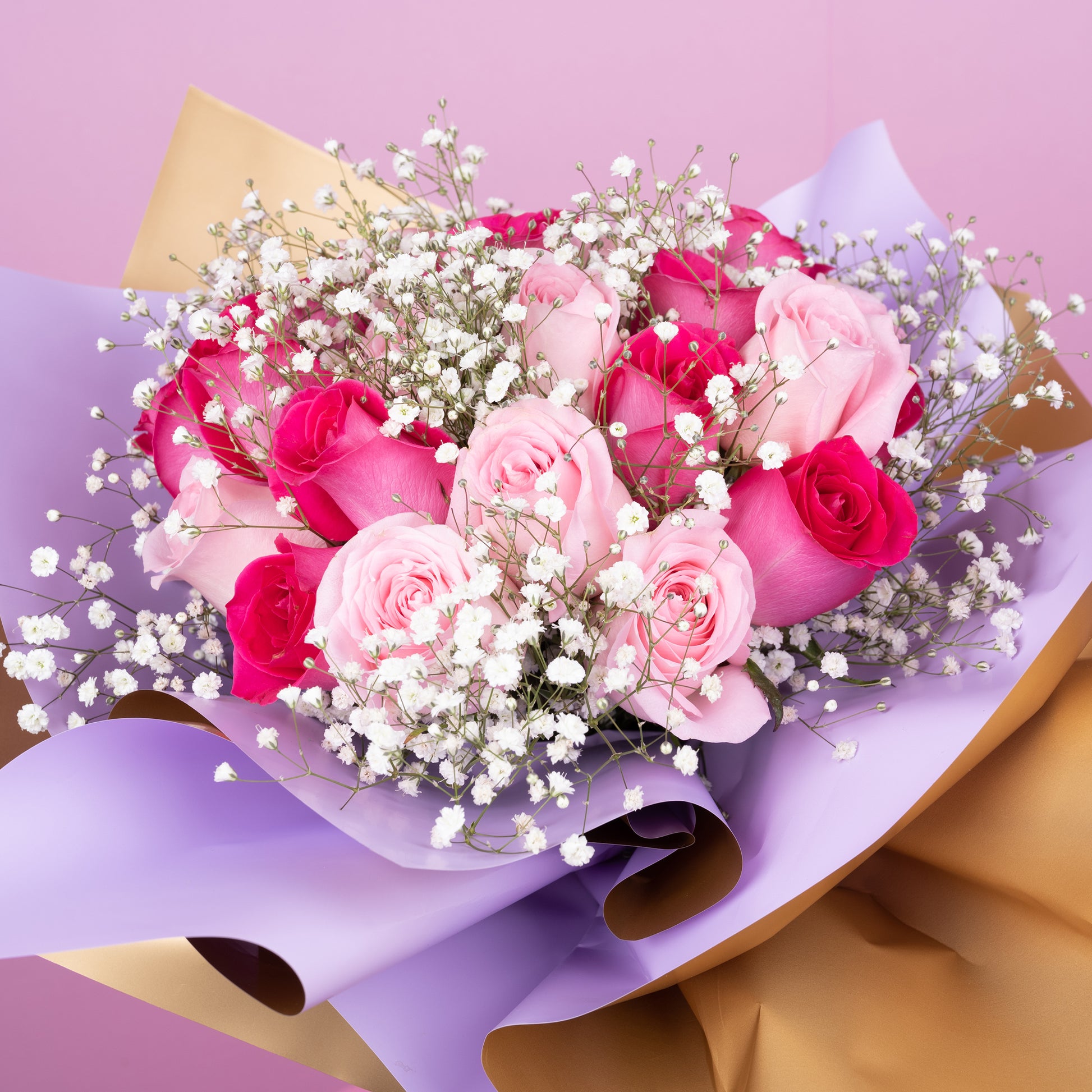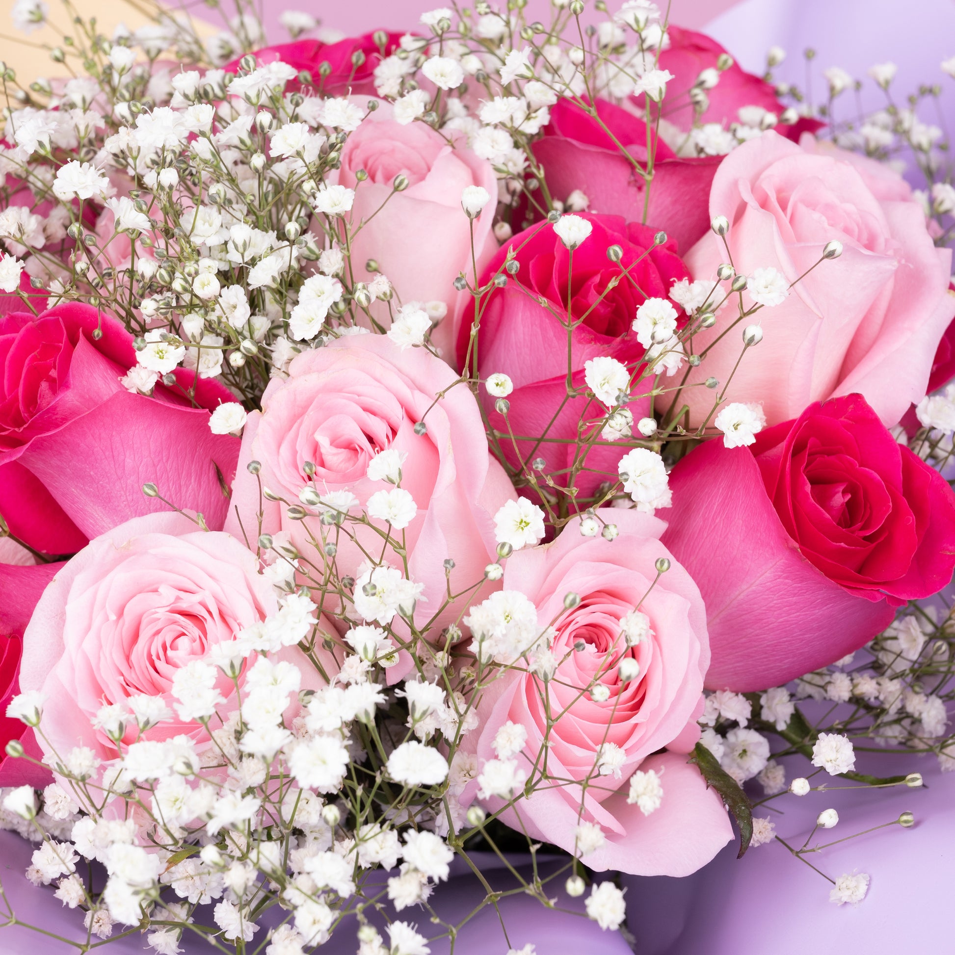 Descripción: Ramo de 24 rosas, compuesto por 12 rosas rosas y 12 rosas fiushas, envuelto con papel especial para flor, adornado con gypsophila.