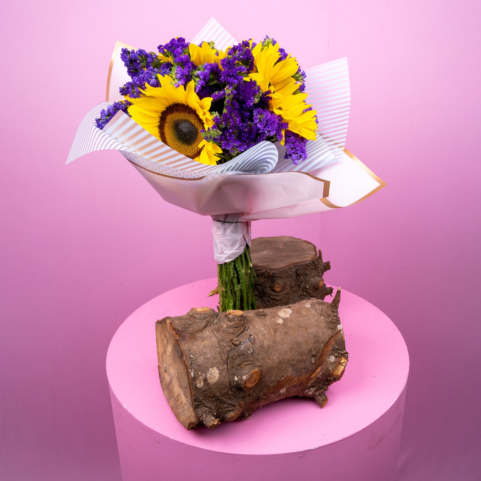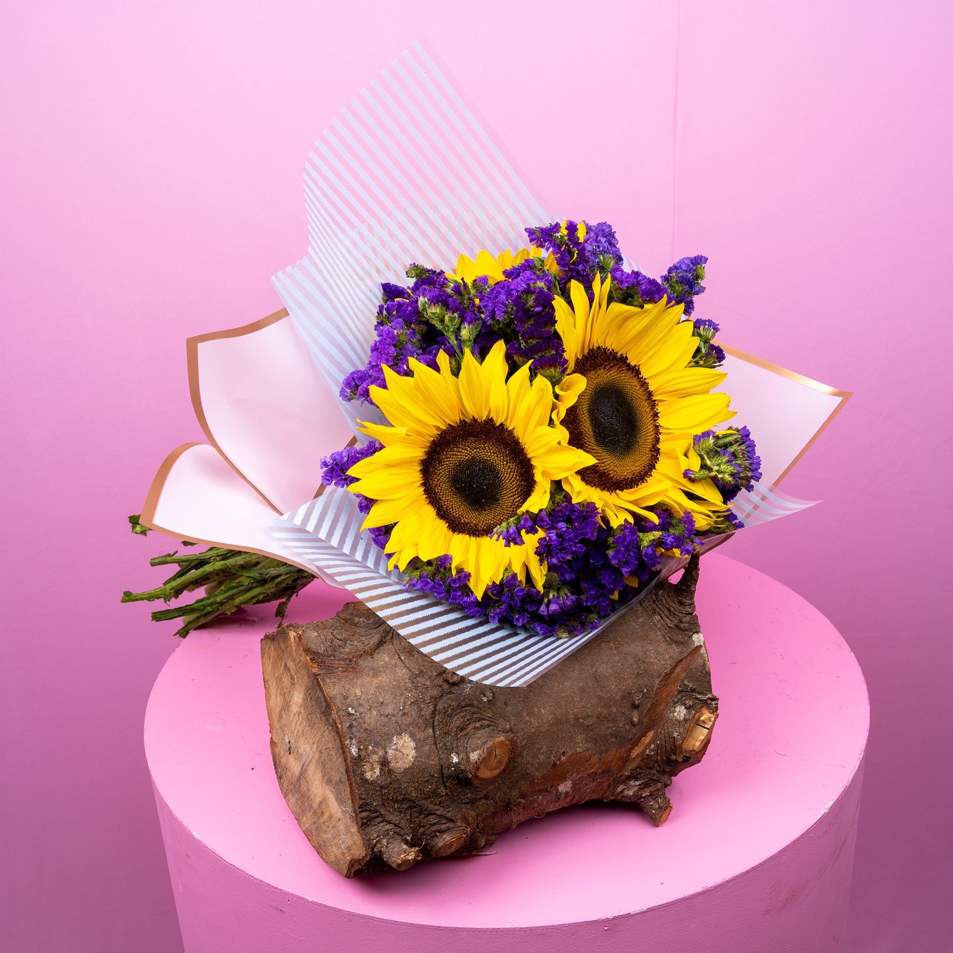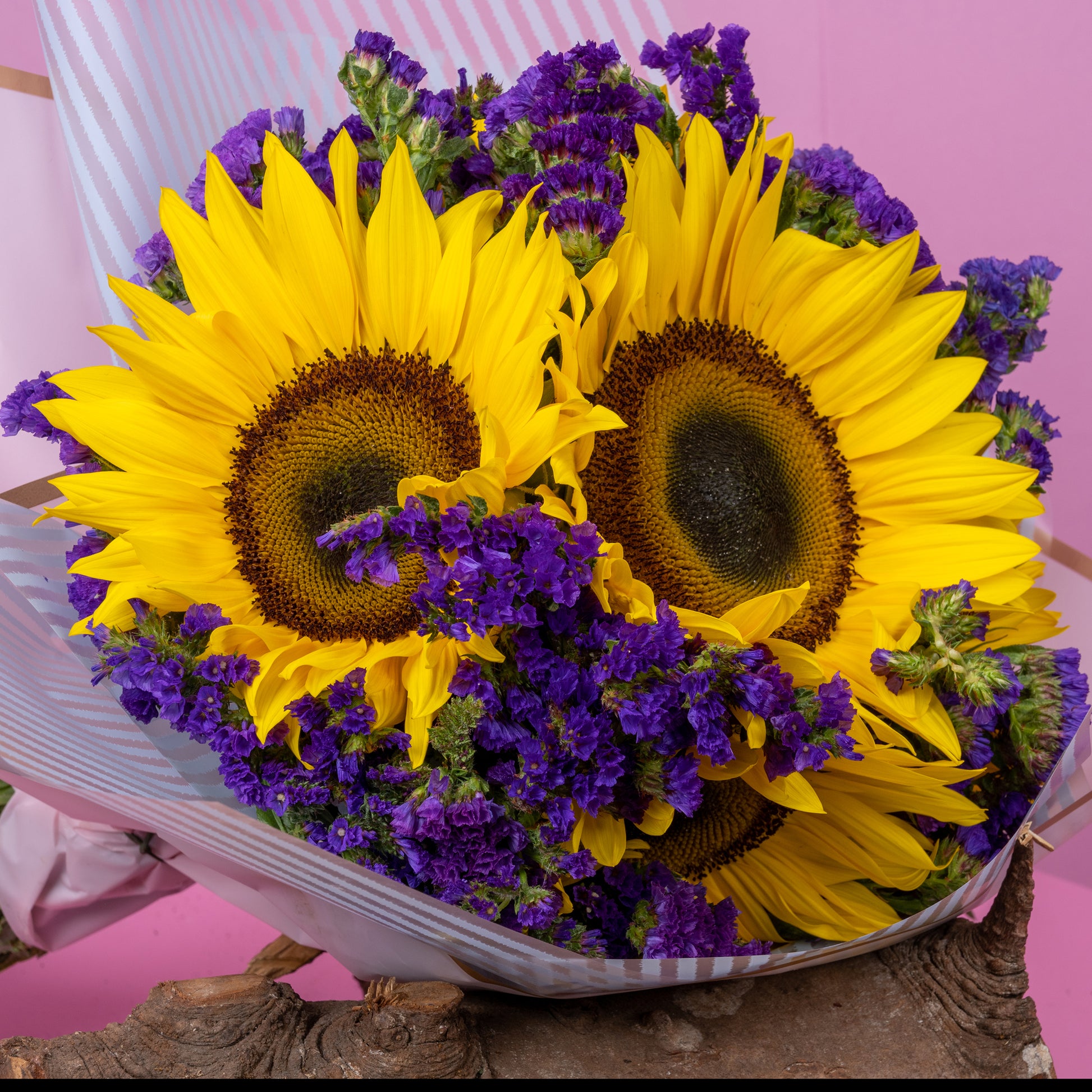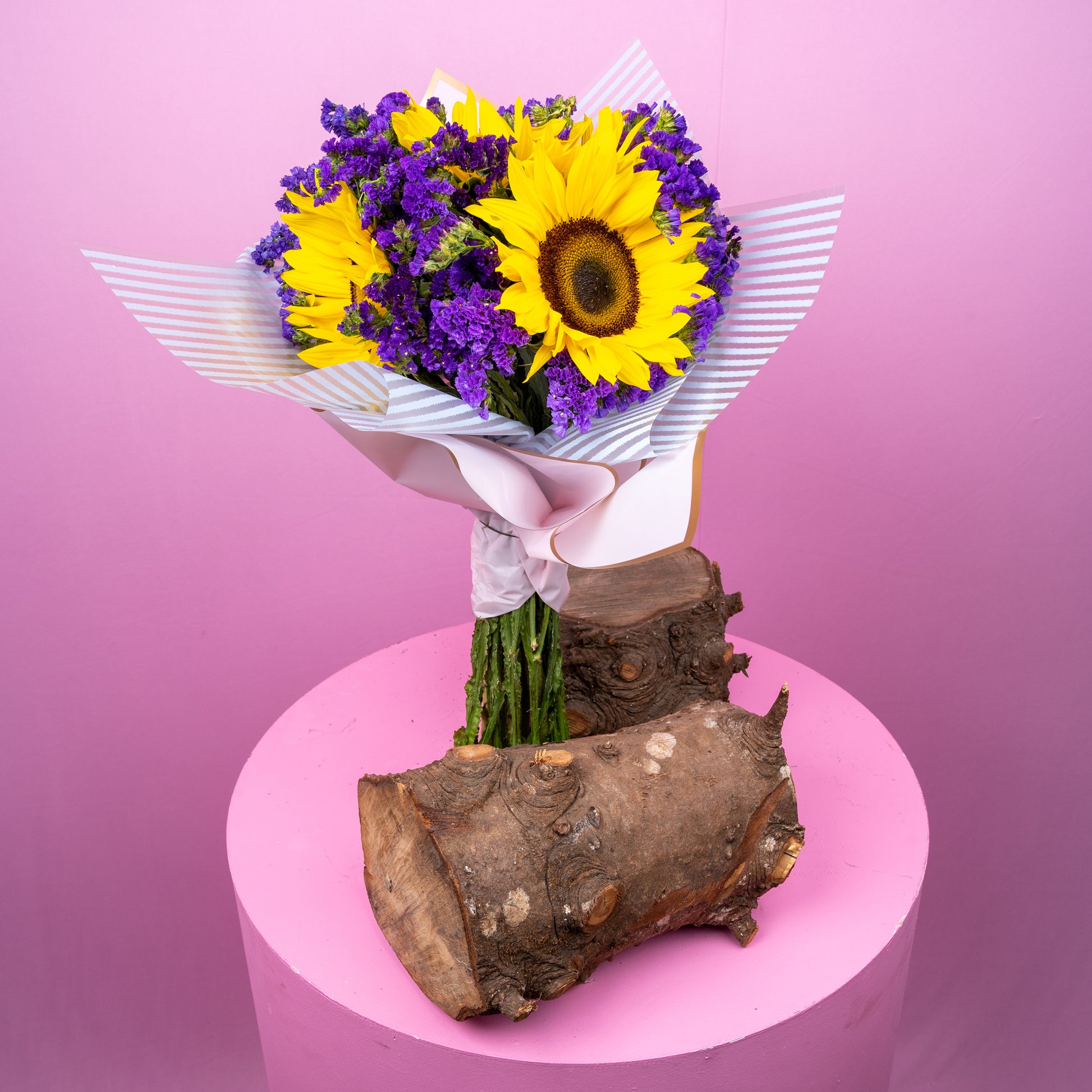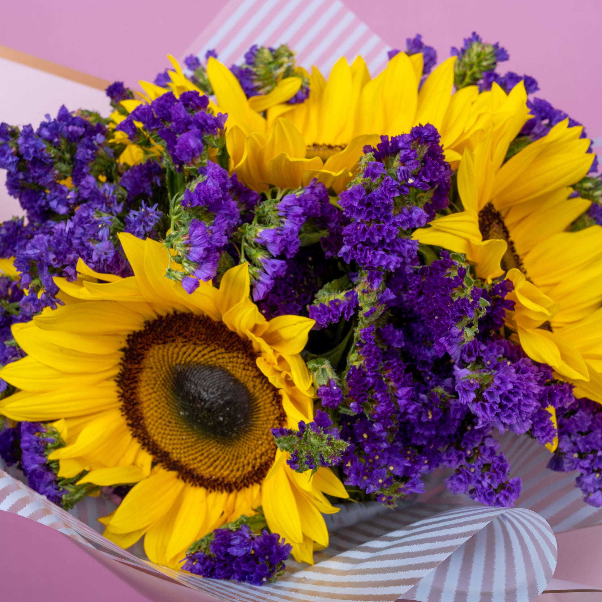 Descripción: Divino atado de tres Girasoles y estati morado, ceñido con papel especial para flor.
