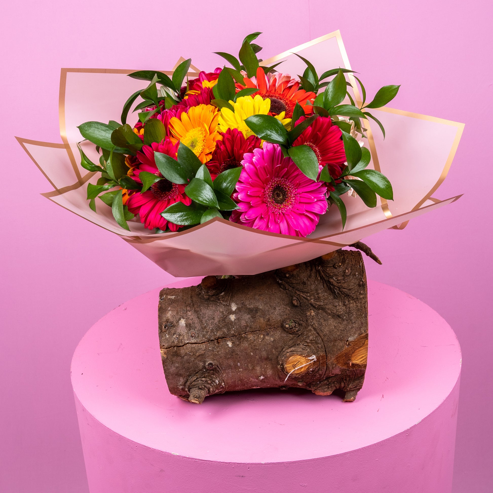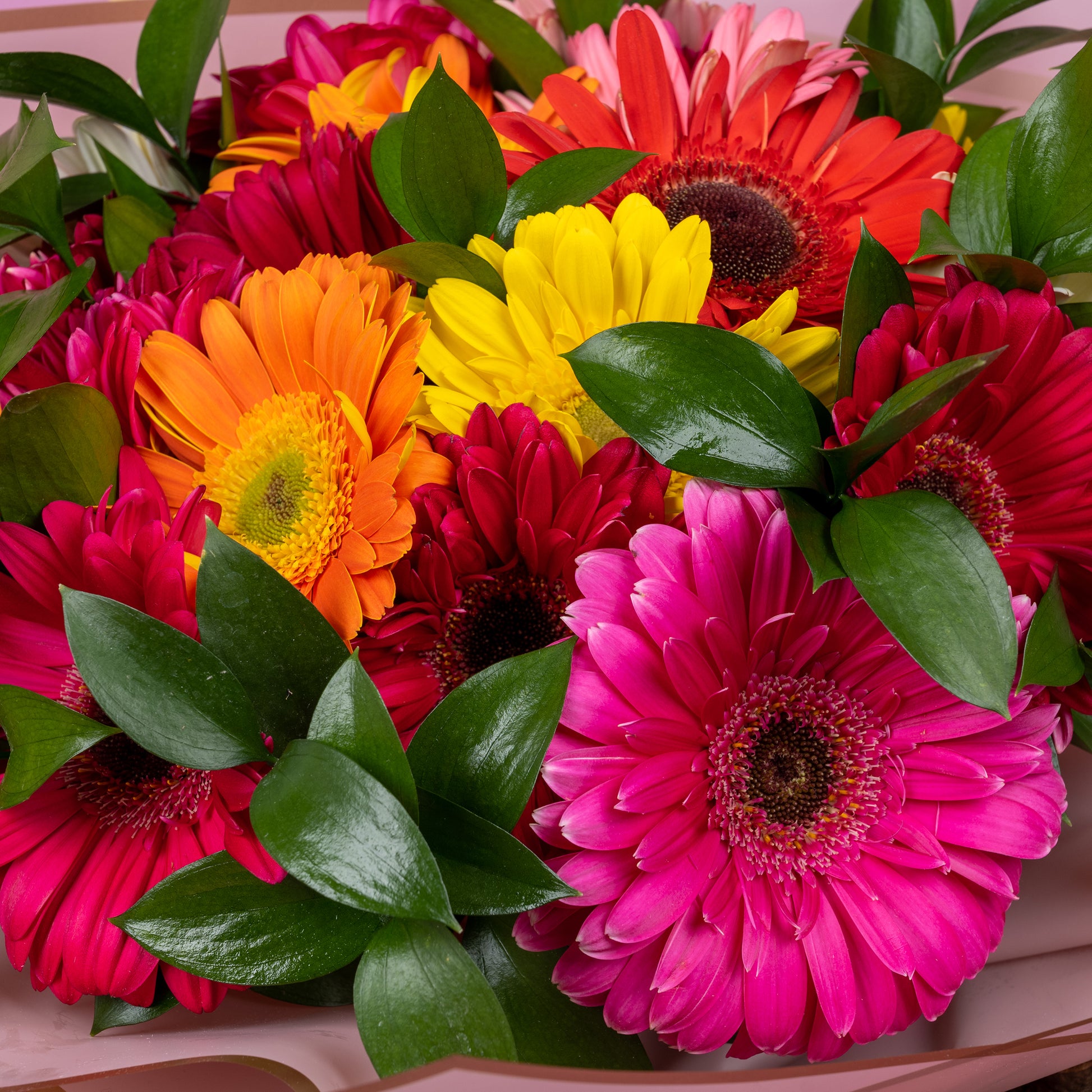 Descripción: Ramo de 12 gerberas de colores, decorada con ruskus, envuelto en papel especial para flor.