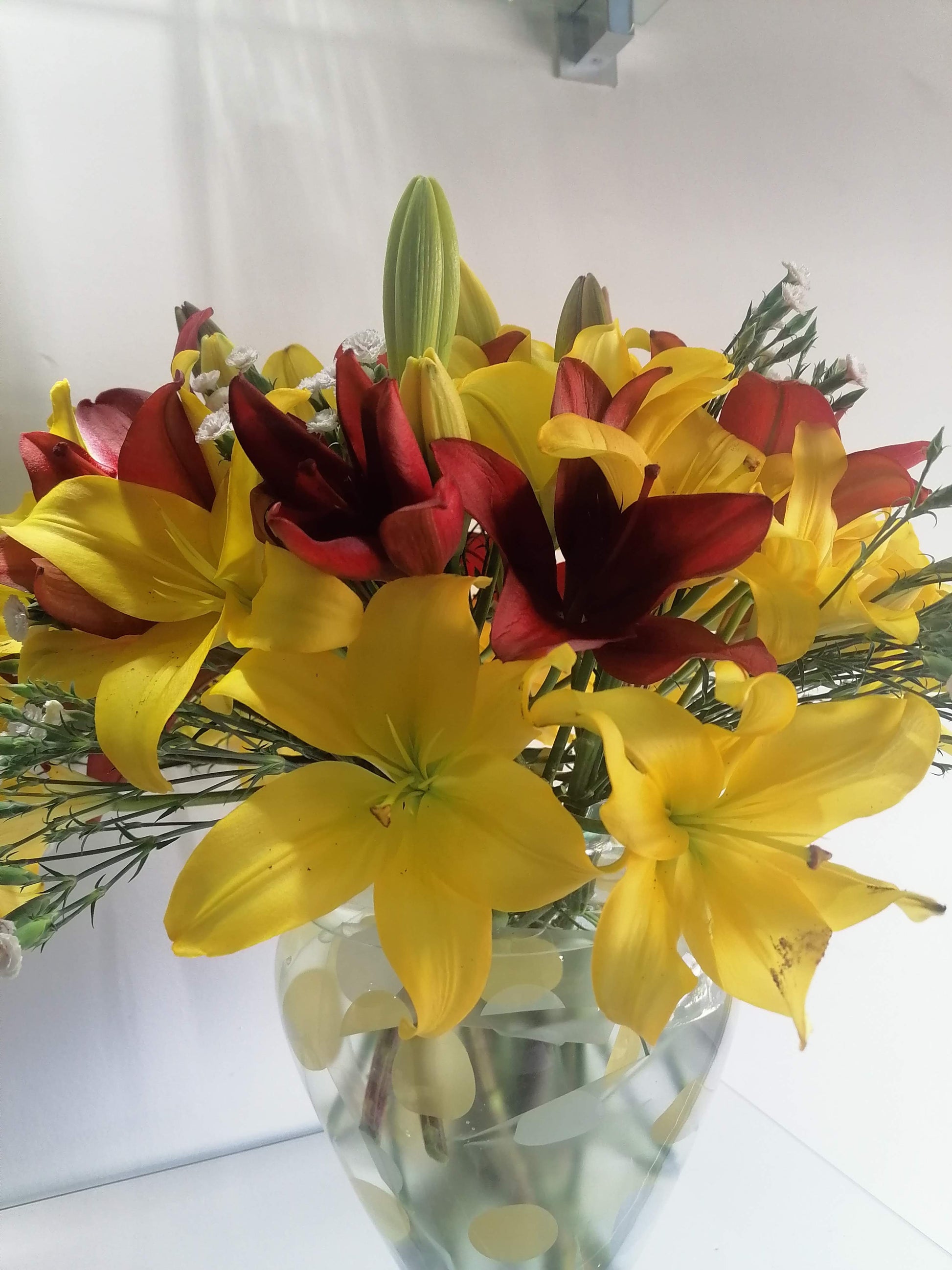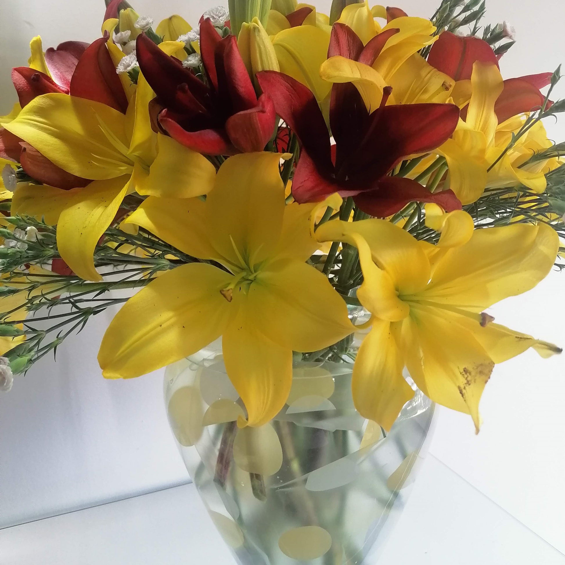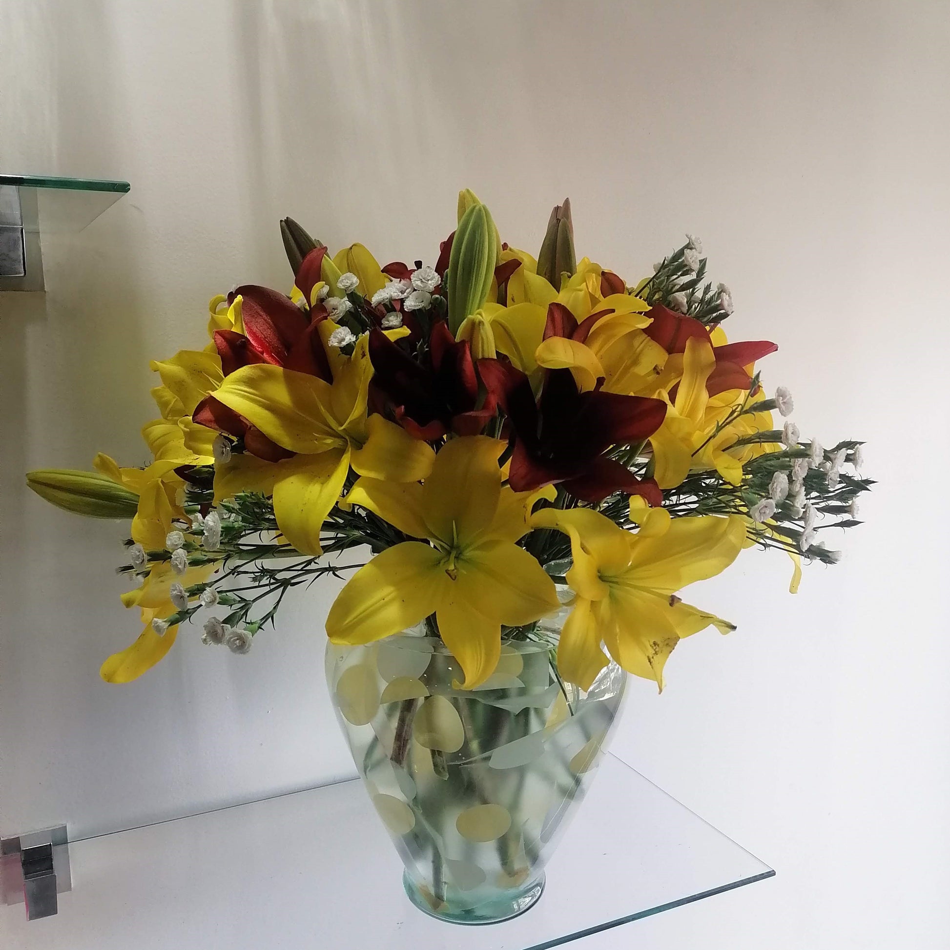 Jarrón de cristal de 50 cm de alto. Lilis amarillas y rojas