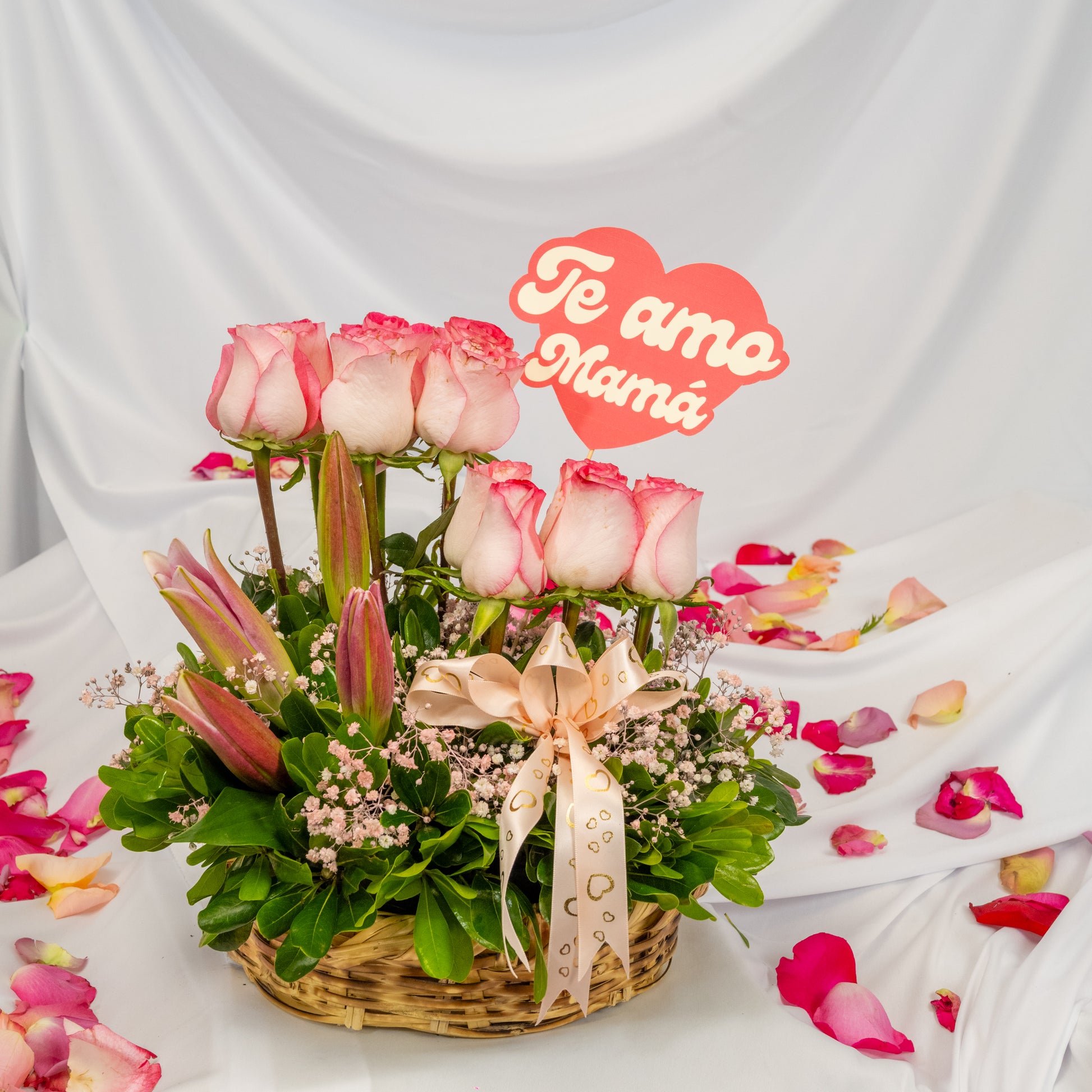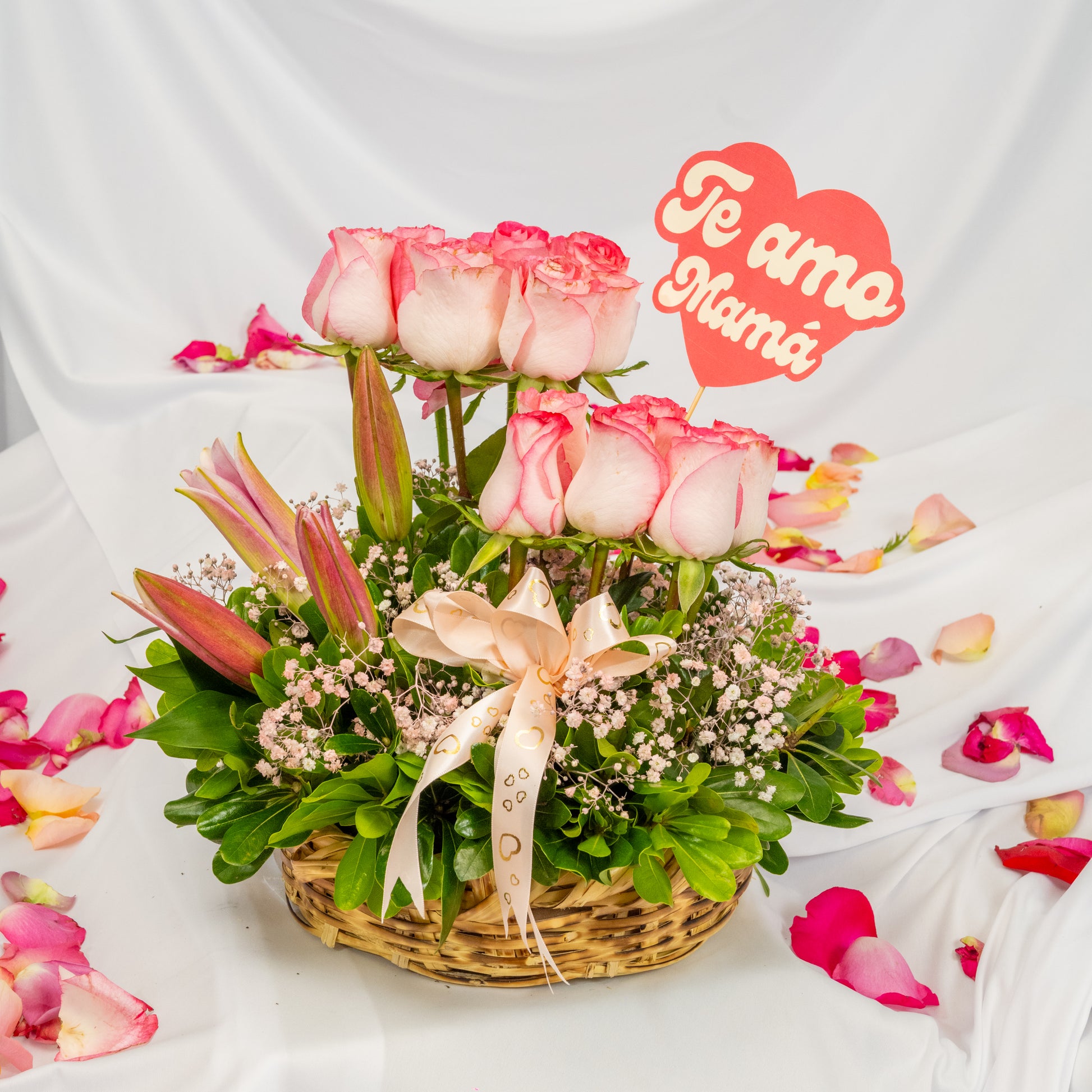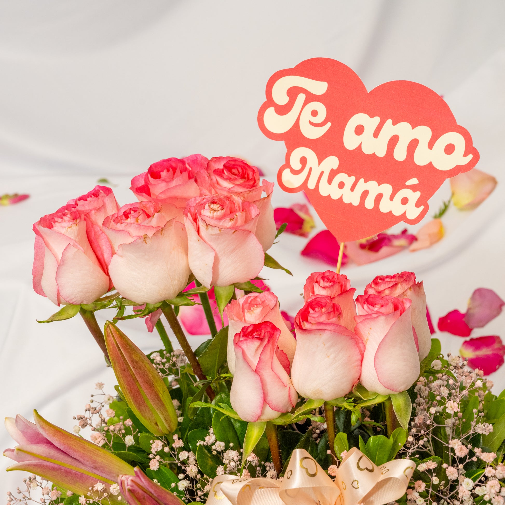 Un arreglo que transmite cariño y elegancia en cada detalle. Arcadia combina la belleza de 12 rosas con la delicadeza de 4 lilis, acompañadas por gypsophila (flor de nube) y ruscus, creando una composición armoniosa y llena de vida. Como toque especial, incluye un corazón impreso en opalina con un mensaje dedicado a mamá lleno de amor y ternura, convirtiéndolo en un detalle pensado para emocionar desde el primer momento.