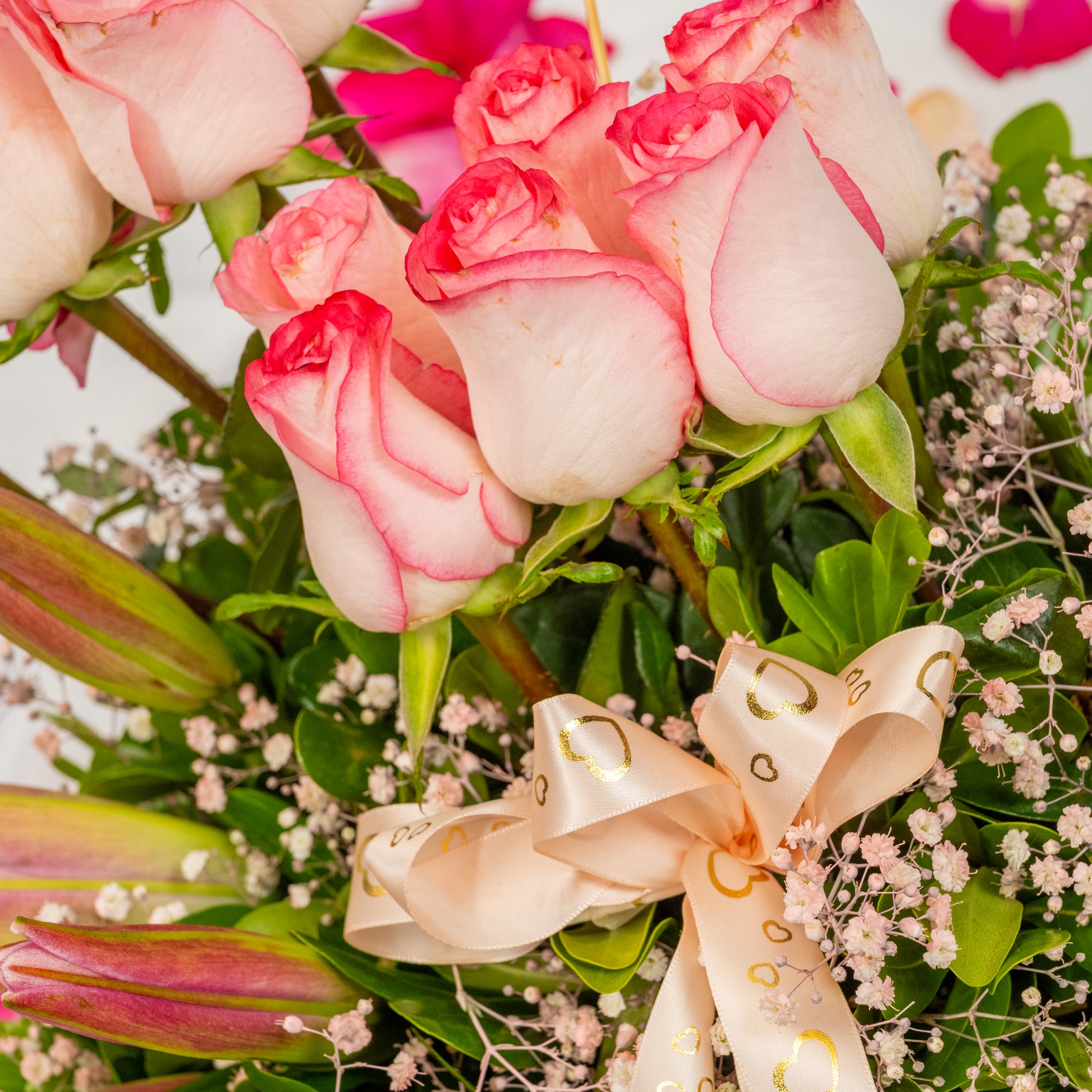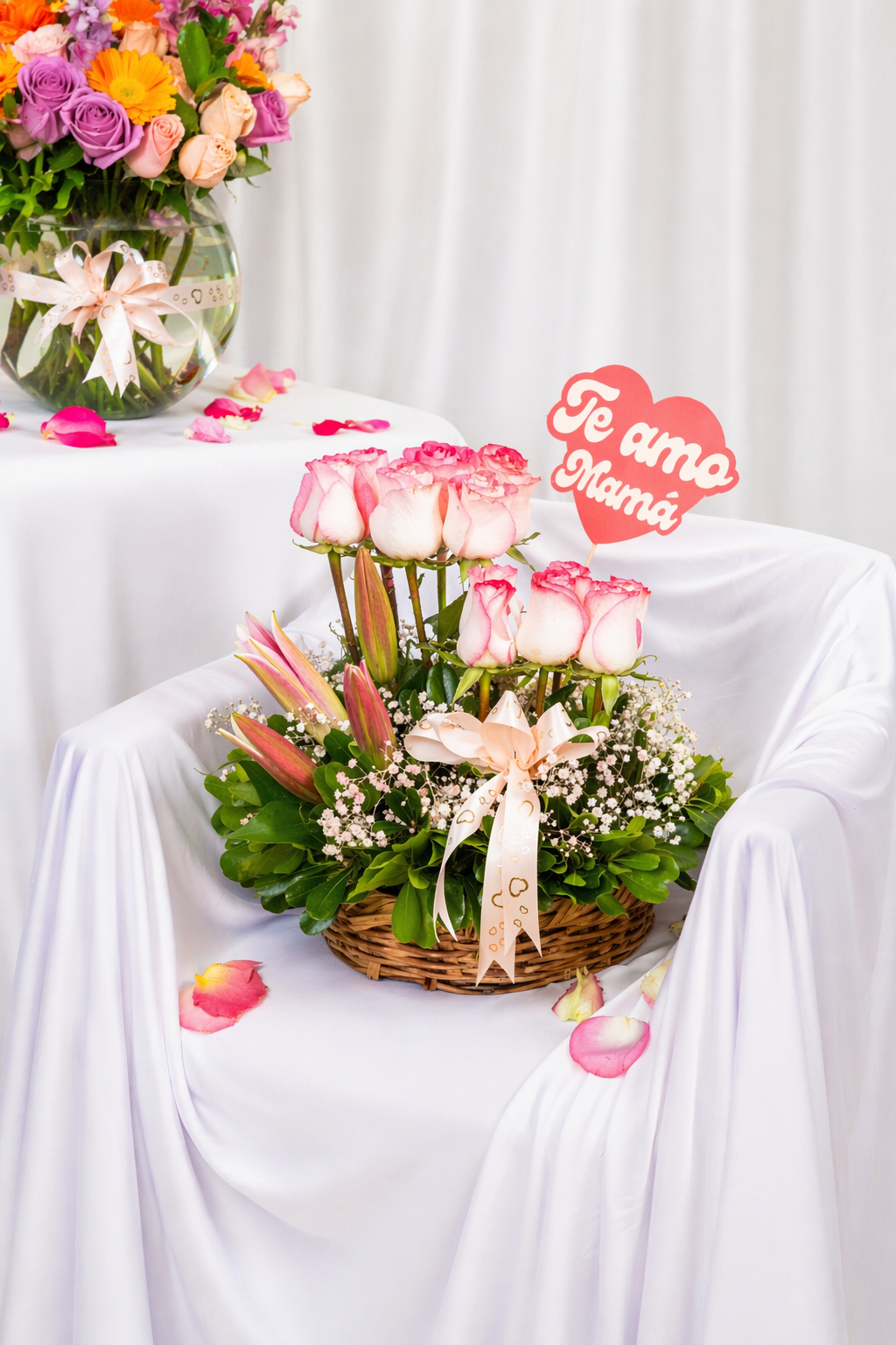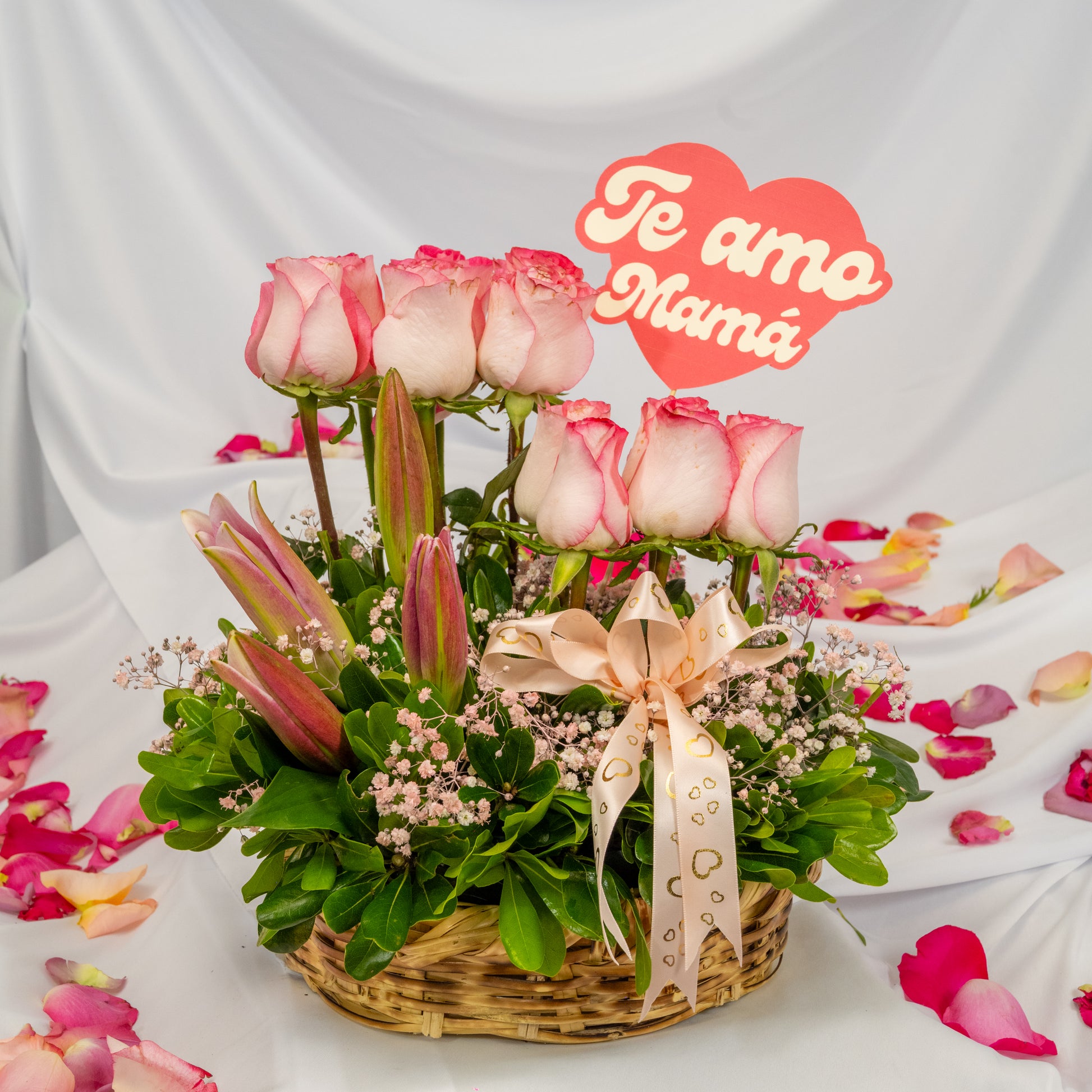 Un arreglo que transmite cariño y elegancia en cada detalle. Arcadia combina la belleza de 12 rosas con la delicadeza de 4 lilis, acompañadas por gypsophila (flor de nube) y ruscus, creando una composición armoniosa y llena de vida. Como toque especial, incluye un corazón impreso en opalina con un mensaje dedicado a mamá lleno de amor y ternura, convirtiéndolo en un detalle pensado para emocionar desde el primer momento.
