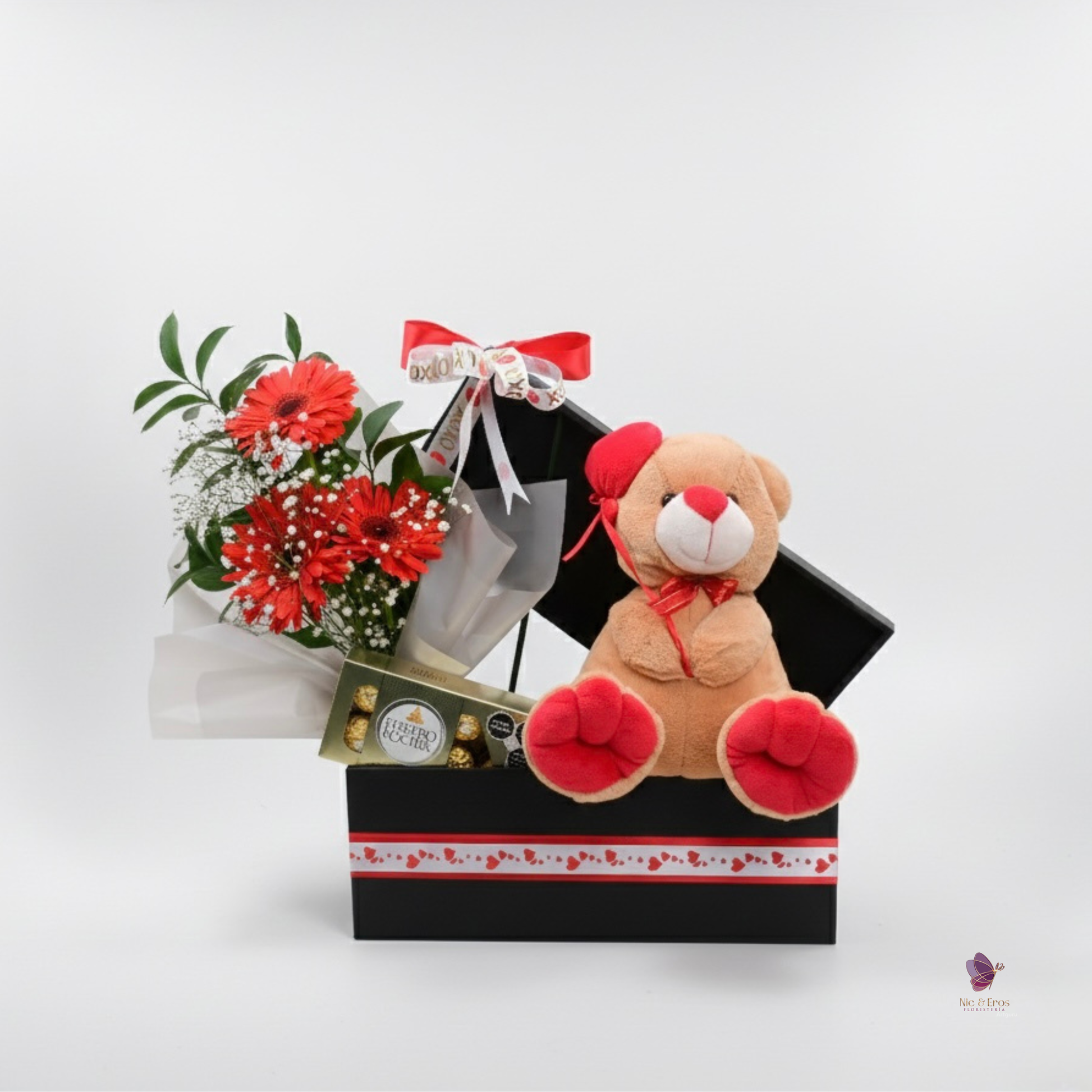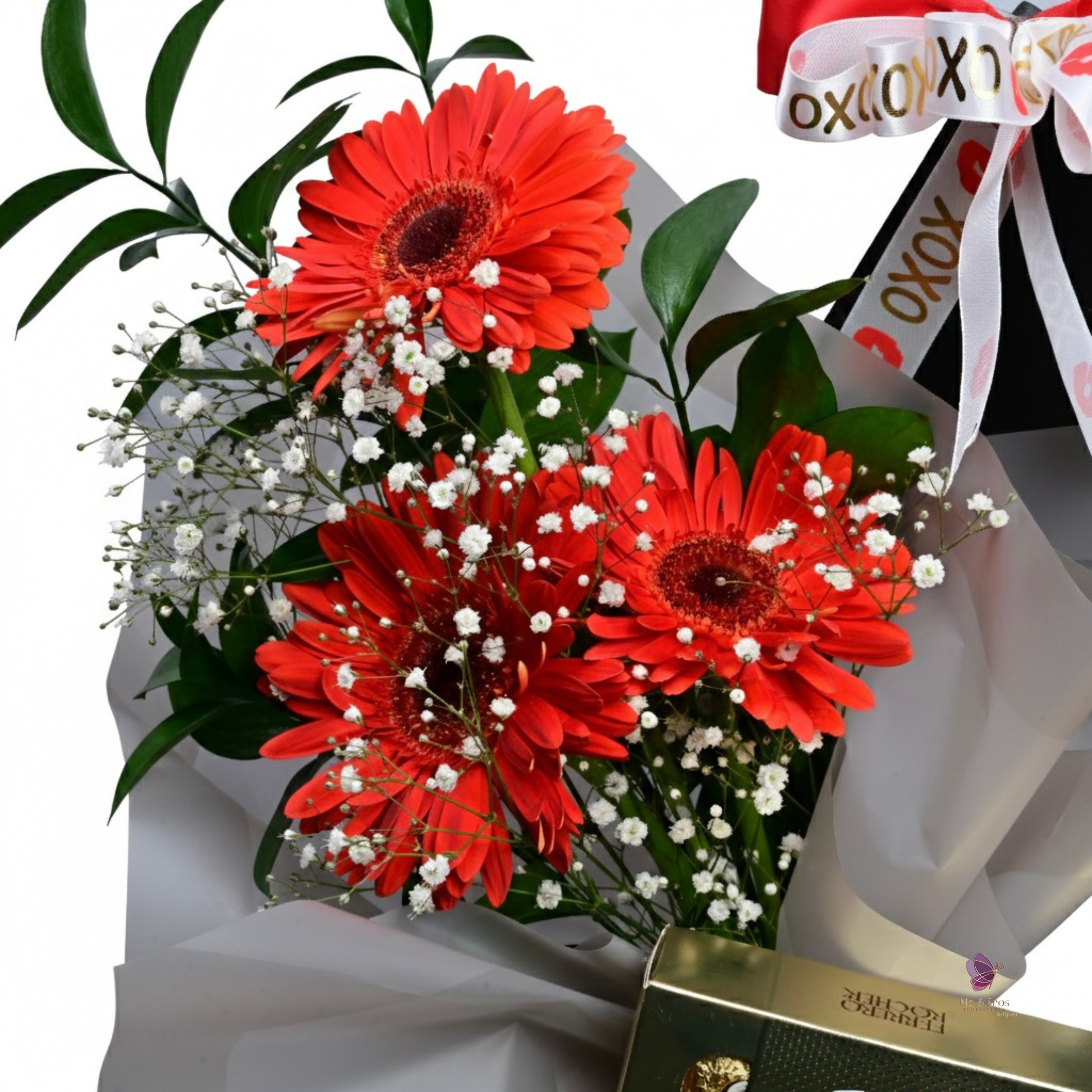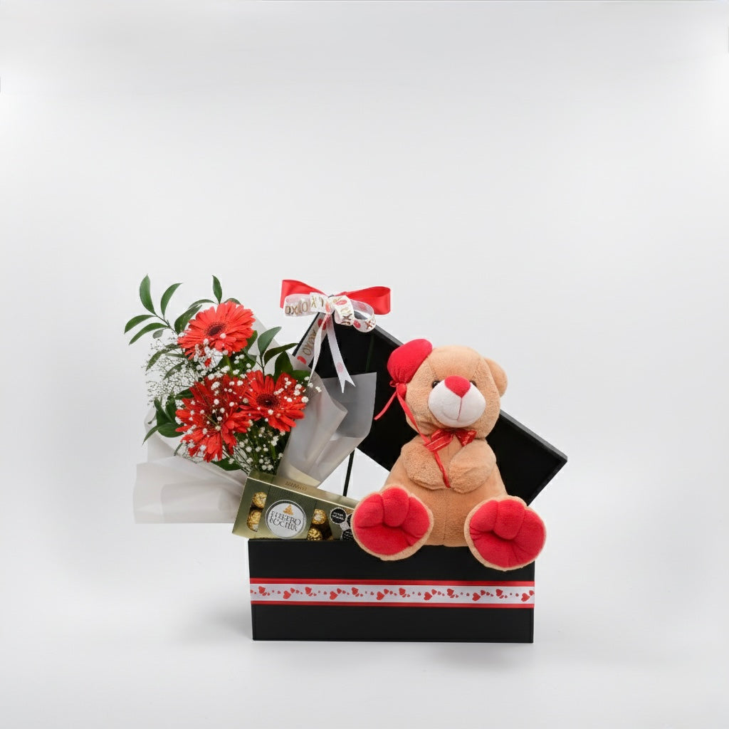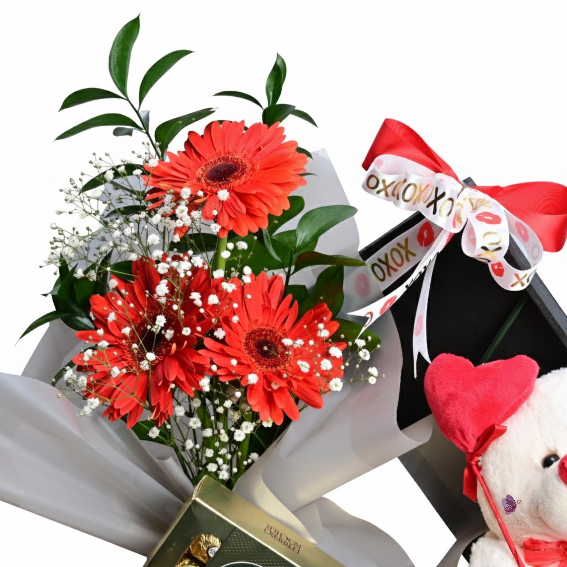 Esta pieza reúne la vibrante energía de 3 gerberas seleccionadas por sus colores y texturas suaves, acompañadas de una deliciosa selección de chocolates para endulzar el momento. Para cerrar con broche de oro, el set incluye un adorable oso de peluche de 30 cm, creando un equilibrio perfecto entre frescura, sabor y ternura.