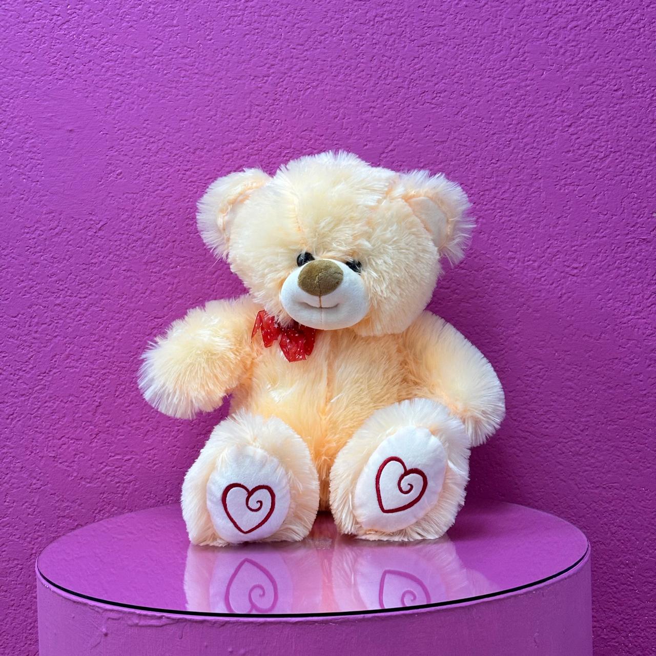Oso sonrisa de tamaño mediano en color marrón o beige, con moño en dos tonos morado y rojo, bonito corazón en cada pata de color del moño.